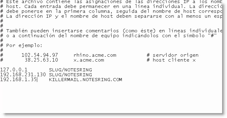 Abrimos el fichero host del servidor lotus domino