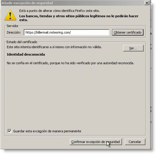 Pulsamos en Confirmar Excepción de Seguridad